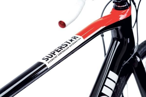 The proprietary bowed top tube, whose form allows for a controlled deformation of the top tube headtube when the frame is subject to strong vertical or horizontal forces such as potholes, poorly surface roads etc. The controlled deformation results above all in a head tube that remains 8% more parallel to its original position, allowing for greater control and predictability of handling when riding in rough conditions.