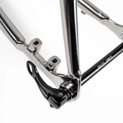 The tubing shape choice applied on Spirit tubing derives from the technical need to preserve stiffness eliminating negative road vibrations reducing the risk of cracks of lightweight tubings. The frame is tig welded with an exception only: the personalized seat lug. This along with the special bottom bracket shell, the original rear dropouts and the “bell shape” steat stays make the rear triangle properly stiff. The frame is built according to an exclusive geometry designed by Irio Tommasini. It is completely chromed, or as a second choice, all “cataforesi” treated, good for extremely thin tubings because it deeply protects them from rust. Maximum attention to detail: an example are the STI bosses (with adjusting screws included) brazed onto the head tube and the engraved enamelled head tube metal badge.