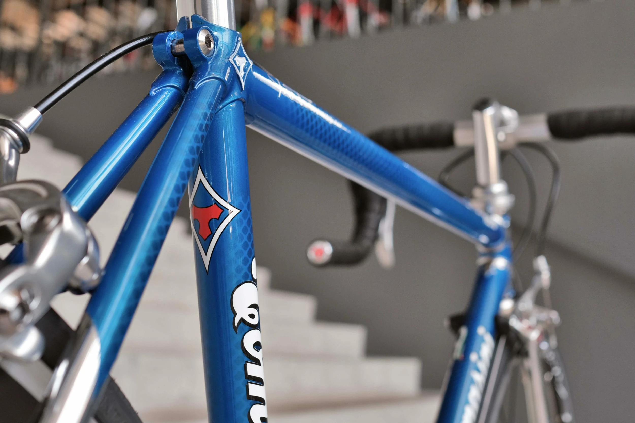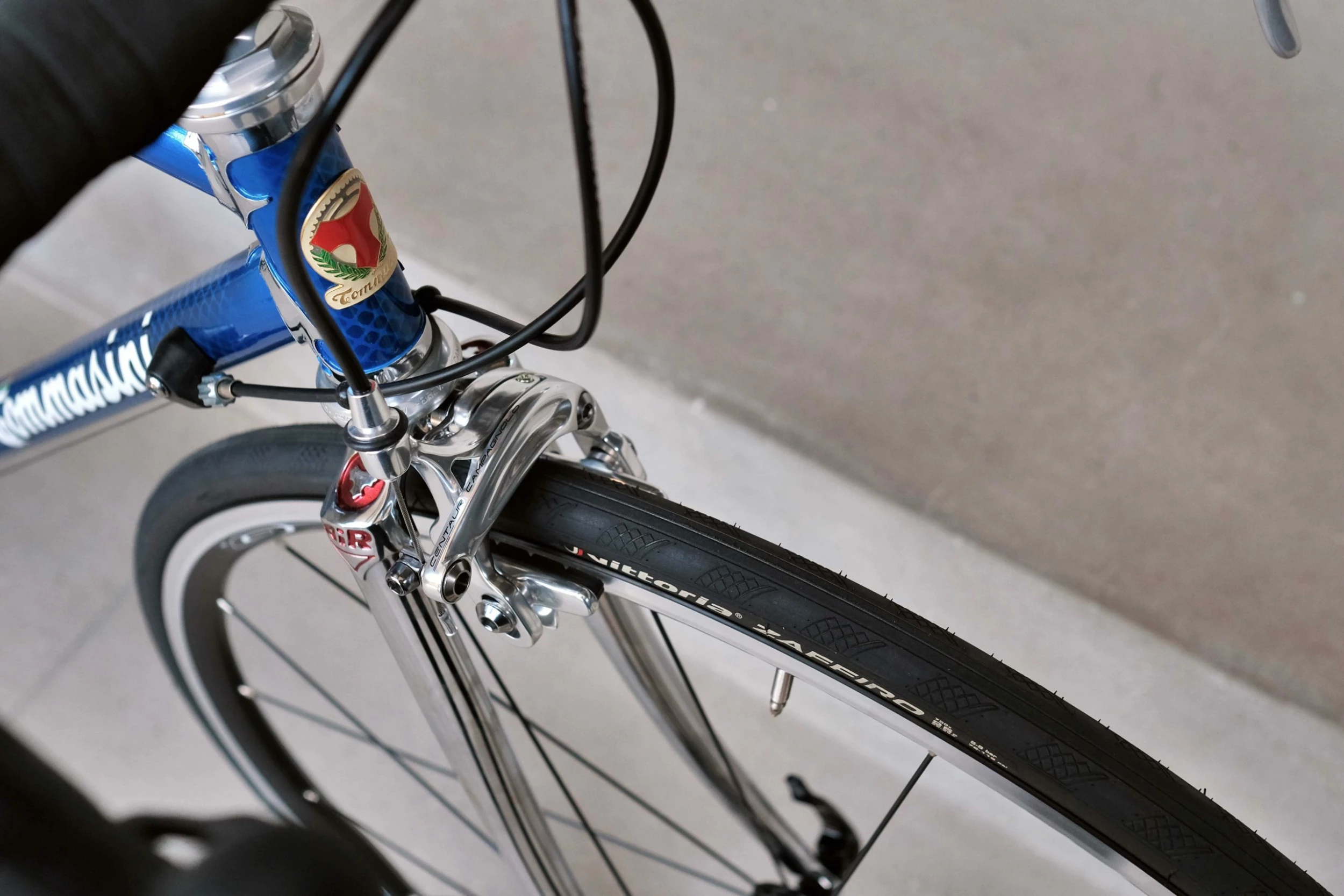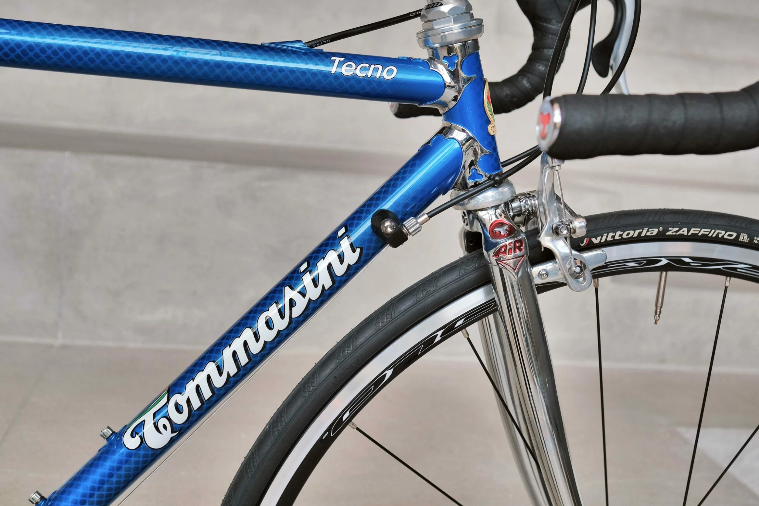 The head tube has a metal badge that has been engraved and enameled.